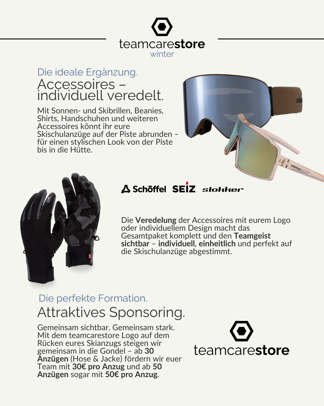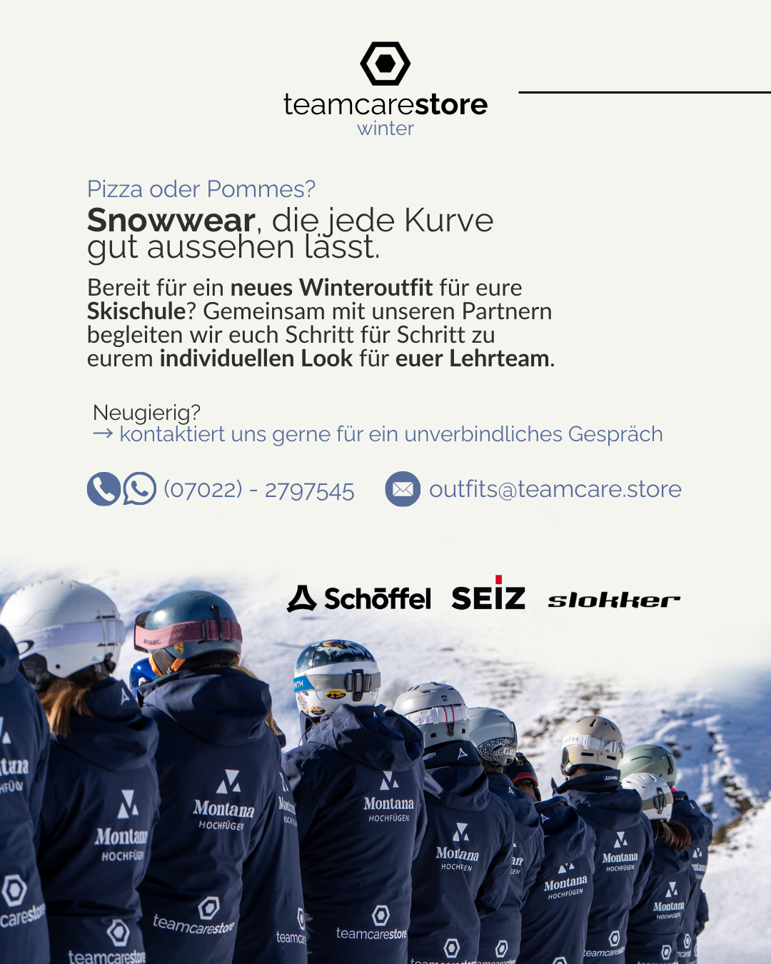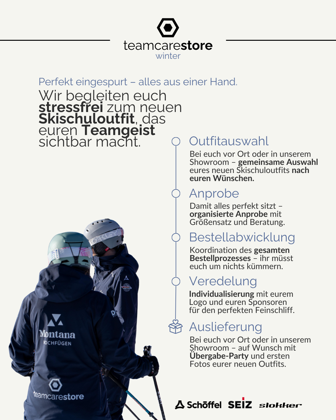 Bereit für ein neues Winteroutfit für eure Skischule oder Wintersportteam? Gemeinsam mit unseren Partnern begleiten wir euch Schritt für Schritt zu eurem individuellen Look für euer Team. Perfekt ergänzt durch unsere Erfahrungen in der ehrenamtlichen Arbeit in Vereinen begleiten wir euch stressfrei über den kompletten Outfitprozess – von der Outfitauswahl bis zur Auslieferung.